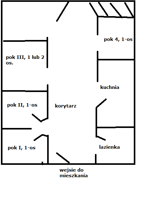 Mieszkanie ma 4 pokoje. Dość spore pokoje – 3x 23m2, 1x7m2. Ja zajmę planowo jeden z nich, a jeden podzielony zostaje na pół, na dwa odrębne pokoje. Stąd cenne dwa okna i dwa grzejniki na jednej ścianie. Dzięki temu mieszkanie staje się 5-pokojowe, a ja zajmując jeden pokój mogę wynajmować aż 4 pokoje, przy czym 3 z założenia mają być 1-os a jeden dwuosobowy tak, by zmaksymalizować korzyści.